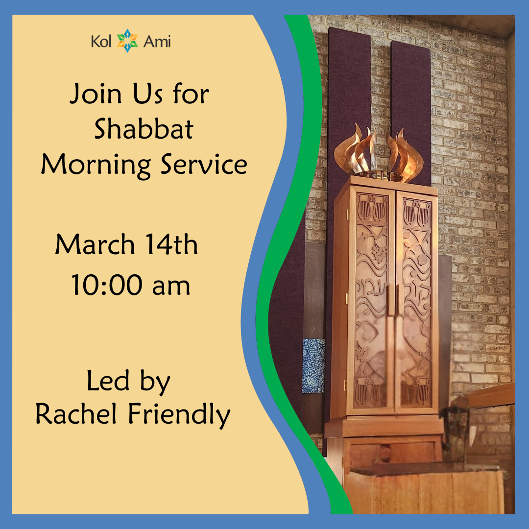 Shabbat services at Kol Ami offer a meaningful time for prayer, music, learning, and community. We typically gather on three Saturdays each month for Shabbat Morning Services and once a month for Kabbalat Shabbat. Services are offered both in person and virtually.